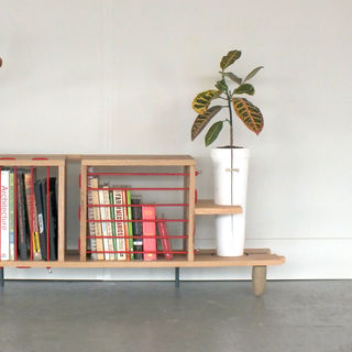 In and On Bench is a, 5' x 16" x 20", custom designed and built entertainment center for our old small apartment and is now our coffee table in our house. I developed this piece out of as much native scrap wood I could find. Made of black walnut, ash, hickory, oak, bungee chord, mild steel, concrete, and basalt lake stone; this contemporary furniture piece holds a wealth of our personal items. With multiple areas for storage: this piece uses bungee chord as cabinet doors as a fun way of interacting with the piece. The two flower pots are concrete that were cast out of a plaster mold we developed; one pot sits in a hole and the other sits on a shelf. One lake stone leg was mortise and tenoned into the piece and is used to demonstrate the furniture's connection to its surroundings: Milwaukee and Great Lakes area. This piece is fun to make and energizes any space.